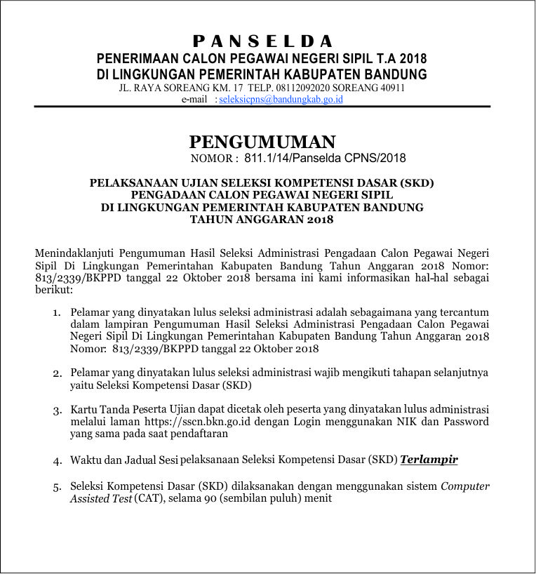 Menindaklanjuti Pengumuman Hasil Seleksi Administrasi Pengadaan Calon Pegawai Negeri Sipil Di Lingkungan Pemerintahan Kabupaten Bandung Tahun Anggaran 2018 Nomor: 813/2339/BKPPD tanggal 22 Oktober 2018 bersama ini kami informasikan hal-hal sebagai berikut: