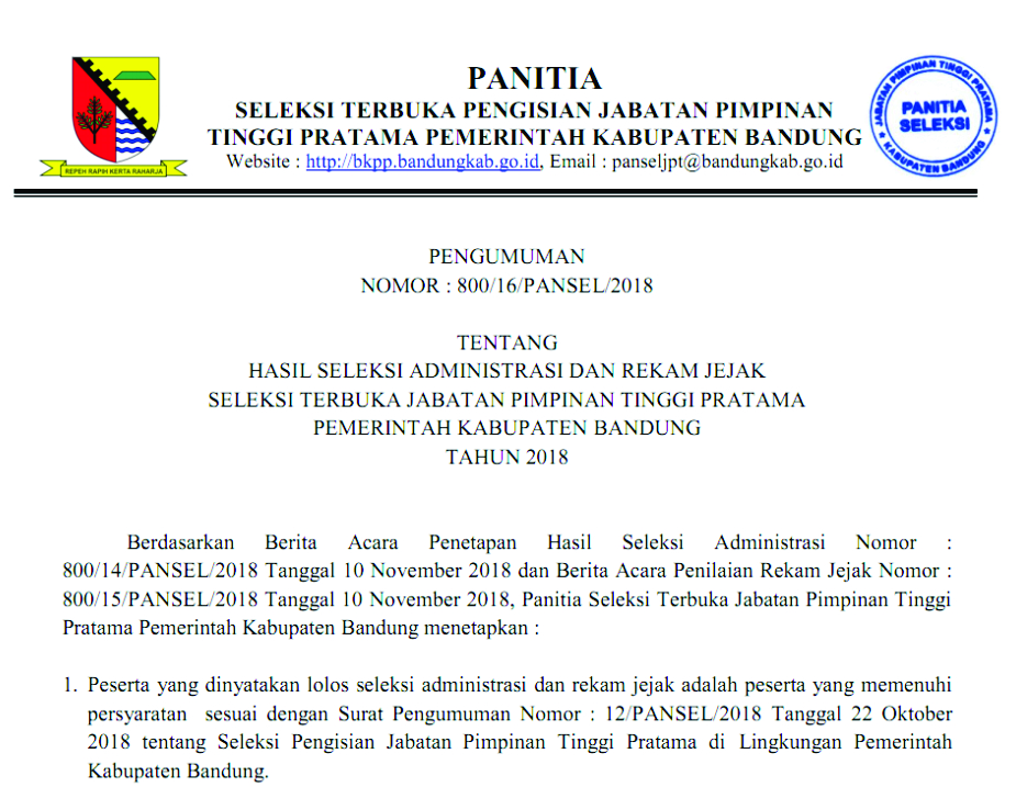 Pengumuman Hasil Seleksi Administrasi Dan Rekam Jejak Seleksi Terbuka Jabatan Pimpinan Tinggi Pratama Pemerintah Kabupaten Bandung