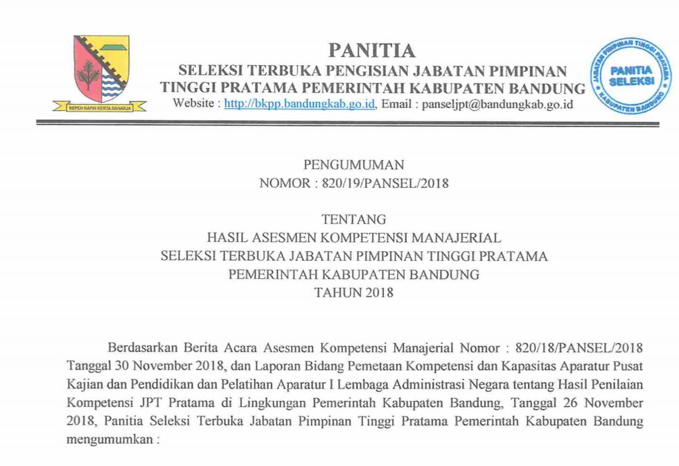 Pengumuman Hasil Assessment Kompetensi Manajerial Seleksi Terbuka Jabatan Pimpinan Tinggi Pratama Pemerintah Kabupaten Bandung