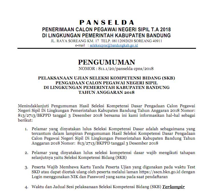 Bersama ini kami sampaikan jadual Seleksi Kompetensi Bidang (SKB) Pengadaan CPNS Kabupaten Bandung Tahun 2018:
