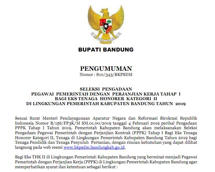 SELEKSI PENGADAAN PEGAWAI PEMERINTAH DENGAN PERJANJIAN KERJA TAHAP I BAGI EKS TENAGA HONORER KATEGORI II DI LINGKUNGAN PEMERINTAH KABUPATEN BANDUNG TAHUN 2019