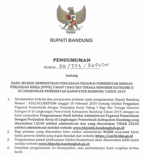 Pengumuman Hasil Seleksi Administrasi Pengadaan Pegawai Pemerintah Dengan Perjanjian Kerja (PPPK) Tahap I Bagi Eks Tenaga Honorer Kategori II Di Lingkungan Pemerintah Kabupaten Bandung Tahun 2019