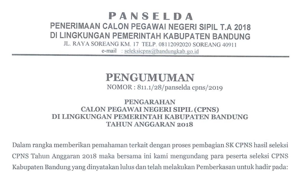 Dalam rangka memberikan pemahaman terkait dengan proses pembagian SK CPNS hasil seleksi CPNS Tahun Anggaran 2018 maka bersama ini kami mengundang para peserta seleksi CPNS