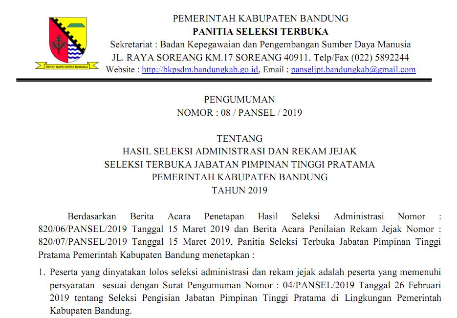 Pengumuman Hasil Administrasi Seleksi Terbuka Pengisian Jabatan Tinggi (JPT) Pratama (BKPSDM, DISHUB, SATPOL-PP & DP2KBP3A) Tahun 2019