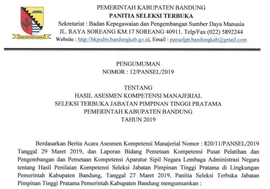 Pengumuman Hasil Assessment Kompetensi Manajerial Seleksi Terbuka Pengisian Jabatan Tinggi (JPT) Pratama (BKPSDM, DISHUB, SATPOL-PP & DP2KBP3A) Tahun 2019