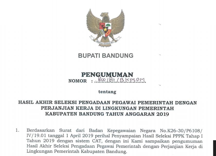 Hasil Akhir Seleksi Pengadaan Pegawai Pemerintah Dengan Perjanjian Kerja di Lingkungan Pemerintah Kabupaten Bandung Tahun Anggaran 2019