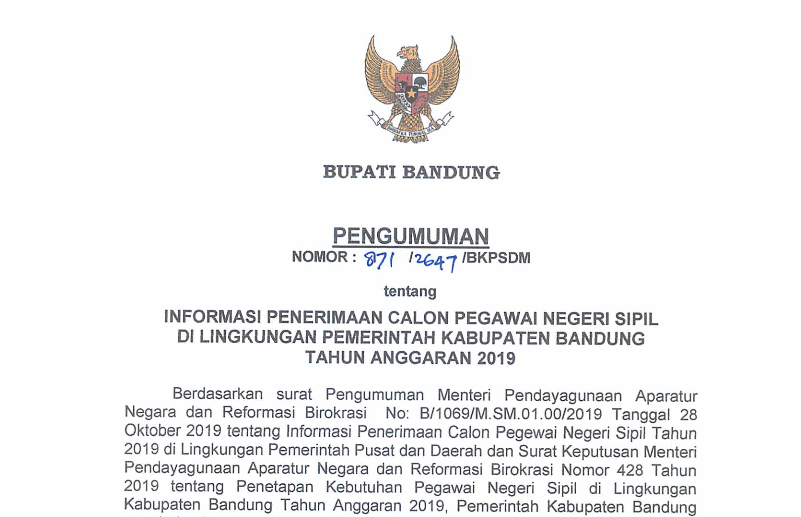 Sesuai Surat Pengumunan Menteri Pendayagunaan Aparatur Negara dan Reformasi Birokrasi No: B/1069/M.SM.01.00/2019 tanggal 28 Oktober Tahun 2019 tentang Informasi Penerimaan Calon Pegawai Negeri Sipil Tahun 2019 di Lingkungan Pemerintah Pusat dan Daerah dan Surat Menteri Pendayagunaan Aparatur Negara dan Reformasi Birokrasi Nomor 428 Tahun 2019 tentang Penetapan Kebutuhan pegawai Aparatur Sipil Negara di Lingkungan Pemerintah Kabupaten Bandung Tahun Anggaran 2019, Pemerintah Kabupaten Bandung akan membuka kesempatan kepada warga/masyarkat yang berminat dan memenuhi syarat untuk menjadi Pegawai Negeri Sipil di Lingkungan Pemerintah Kabupaten Bandung melalui pendaftaran online melalui portal Sistem Seleksi CPNS Nasional (SSCASN) Badan Kepegawaian Negara (BKN).