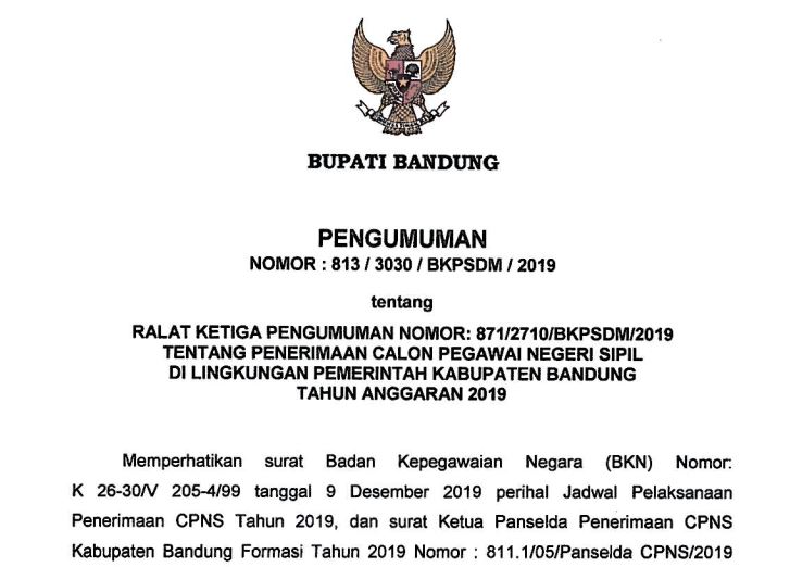 Memperhatikan surat Badan Kepegawaian Negara (BKN) Nomor: K 26-30/V 205-4/99 tanggal 9 Desember 2019 perihal Jadwal Pelaksanaan Penerimaan CPNS Tahun 2019, dan surat Ketua Panselda Penerimaan CPNS Kabupaten Bandung Formasi Tahun 2019 Nomor : 811.1/05/Panselda CPNS/2019 tanggal 12 Desember 2019 tentang Revisi Permohonan Perpanjangan Jadwal, dengan ini disampaikan terdapat perubahan ketiga kali dalam pengumuman Nomor: 871/ 2710/BKPSDM/2019 tanggal 8 November 2019 tentang Penerimaan Calon Pegawai Negeri Sipil (CPNS) di Lingkungan Pemerintah Kabupaten Bandung Tahun Anggaran 2019