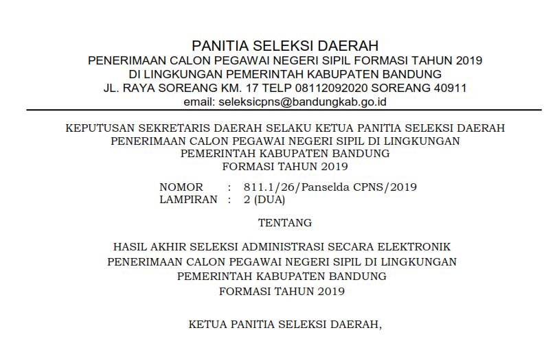 Berdasarkan Hasil verifikasi ulang terhadap berkas pelamar yang mengajukan sanggahan dalam tahapan Seleksi Administrasi penerimaan Penerimaan Calon Pegawai Negeri Sipil Formasi Tahun 2019 di Lingkungan Pemerintah Kabupaten Bandung, maka Pemerintrah Kabupaten Bandung melalui Panitia Seleksi Daerah Mengumumkan Hasil Akhir Seleksi Adminstrasi melalui keputusan Ketua Panitia Seleksi Daerah Penerimaan Calon Pegawai Negeri Sipil Formasi Tahun 2019 di Lingkungan Pemerintah Kabupaten Bandung Nomor: 811.1/26/Panselda CPNS/2019 tanggal 30 Desember 2019 tentang Hasil Akhir Seleksi Administrasi Secara Elektronik Penerimaan Calon Pegawai Negeri Sipil di Lingkungan Pemerintah Kabupaten Bandung Formasi Tahun 2019.