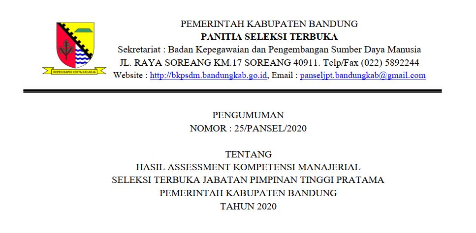 Pengumuman Hasil Assessment Kompetensi Manajerial Seleksi Terbuka Pengisian Jabatan Tinggi (JPT) Pratama Tahun 2020