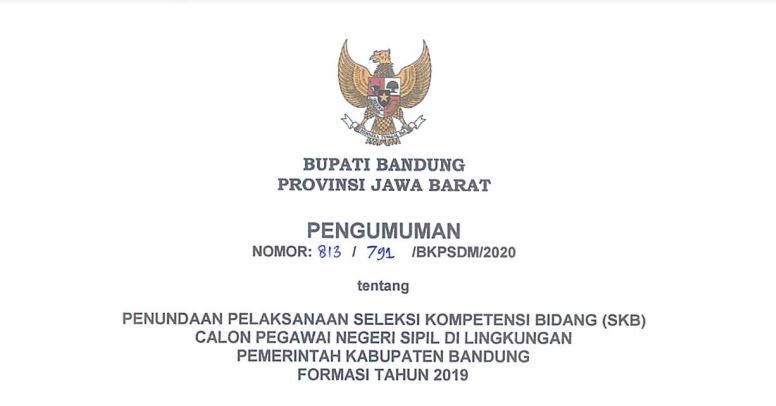 Memperhatikan Surat Menteri Pendayagunaan Aparatur Negara dan Reformasi Birokrasi Republik Indonesia tersebut bahwa Seleksi Kompetensi Bidang Calon Pegawai Negeri Sipil di Lingkungan Pemerintah Kabupaten Bandung yang semula direncanakan akan dilaksanakan dalam rentang 25 Maret 2020 sampai dengan 10 April 2020 DITUNDA sampai dengan adanya jadwal terbaru yang ditetapkan oleh Panitia Seleksi Nasional. =>Pengumuman lengkap terkait penundaan pelaksanaan SKB bisa didownload disini.