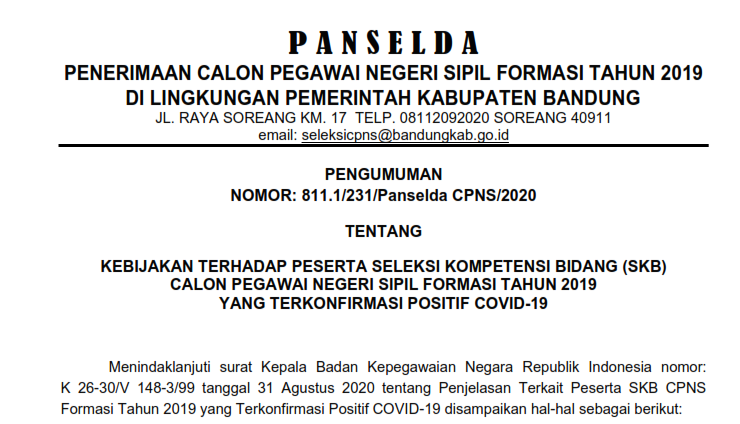Menindaklanjuti surat Kepala Badan Kepegawaian Negara Republik Indonesia nomor:K 26-30/V 148-3/99 tanggal 31 Agustus 2020 tentang Penjelasan Terkait Peserta SKB CPNS Formasi Tahun 2019 yang Terkonfirmasi Positif COVID-19 disampaikan hal-hal sebagai berikut: