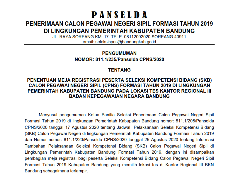 Menyusul pengumuman Ketua Panitia Seleksi Penerimaan Calon Pegawai Negeri Sipil Formasi Tahun 2019 di lingkungan Pemerintah Kabupaten Bandung nomor: 811.1/208/Panselda CPNS/2020 tanggal 17 Agustus 2020 tentang Jadwal Pelaksanaan Seleksi Kompetensi Bidang (SKB) Calon Pegawai Negeri di lingkungan Pemerintah Kabupaten Bandung Formasi Tahun 2019 dan Nomor nomor: 811.1/220/Panselda CPNS/2020 tanggal 25 Agustus 2020 tentang Informasi Tambahan Pelaksanaan Seleksi Kompetensi Bidang (SKB) Calon Pegawai Negeri Sipil di Lingkungan Pemerintah Kabupaten Bandung Formasi Tahun 2019, dengan ini disampaikan pembagian meja registrasi bagi peserta Seleksi Kompetensi Bidang Calon Pegawai Negeri Sipil Formasi Tahun 2019 Kabupaten Bandung yang memilih lokasi tes di Kantor Regional III BKN Bandung sebagaimana terlampir