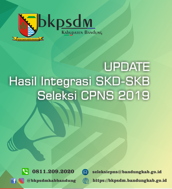 Berdasarkan surat Kepala Badan Kepegawaian Negara Republik Indonesia selaku Ketua Tim Pelaksana Seleksi Nasional Pengadaan CPNS 2019 nomor: 26-30/B6108/XI/20.03 tanggal 5 November 2020 perihal Penyampaian Hasil Integrasi Nilai SKD-SKB CPNS Pemerintah Kabupaten Bandung Tahun 2019, dengan ini disampaikan hal-hal sebagai berikut: