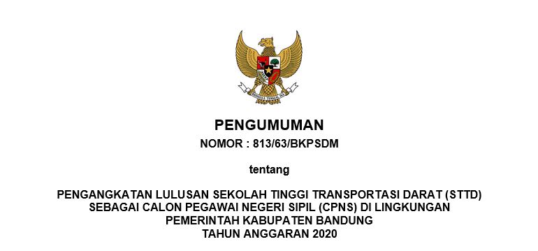 Berdasarkan Keputusan Menteri Pendayagunaan Aparatur Negara dan Reformasi Birokrasi Nomor 805 Tahun 2020 tentang Penetapan Kebutuhan Pegawai Negeri Sipil dari Lulusan Sekolah Tinggi Transportasi Darat di Lingkungan Pemerintah Kabupaten Bandung Tahun Anggaran 2020 dan surat Badan Kepegawaian Negara Republik Indonesia nomor:D 26-30/V 16-8/99 tanggal 7 Januari 2021 perihal Penyelesaian Penetapan NIP CPNS Lulusan Politeknik Transportasi Darat Indonesia-STTD Tahun Anggaran 2020, dengan ini disampaikan hal-hal sebagai berikut: