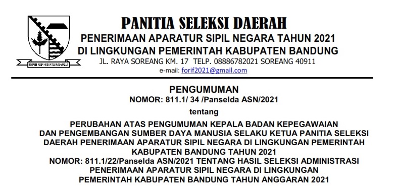 Perubahan Pengumuman Seleksi Administrasi Pengadaan Calon Aparatur Sipil Negara Di Lingkungan Pemerintah Kabupaten Bandung Tahun Anggaran 2021