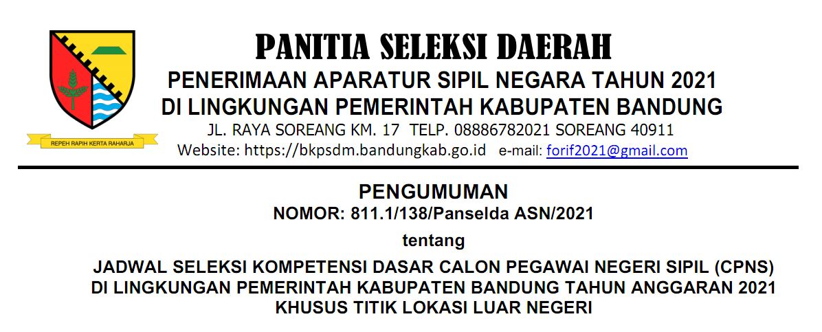 Jadwal SKD CPNS Di Lingkungan Pemerintah Kabupaten Bandung Tahun Anggaran 2021 Khusus Titik Lokasi Luar Negeri
