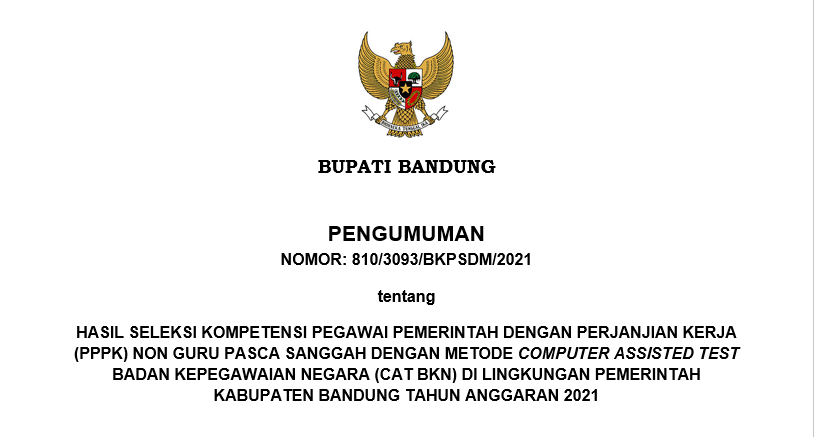 Berdasarkan surat Plt Kepala Badan Kepegawaian Negara Republik Indonesia selaku Ketua Tim Pelaksana Seleksi Nasional Pengadaan CASN 2021 nomor: 14929.2/B-KS.04.03/SD/K/2021 tanggal 29 November 2021 perihal Penyampaian Hasil Seleksi Calon PPPK Jabatan Fungsional Tahun 2021 yang disampaikan kepada instansi Pemerintah Kabupaten Bandung secara elektronik pada tanggal 29 November 2021