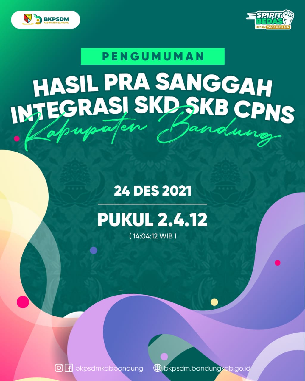 Berdasarkan surat Plt Kepala Badan Kepegawaian Negara Republik Indonesia selaku Ketua Tim Pelaksana Seleksi Nasional Pengadaan CASN 2021 nomor: 18404.2/B-KS.04.03/SD/K/2021 tanggal 22 Desember 2021 perihal Penyampaian Hasil Integrasi Nilai SKD-SKB CPNS Tahun 2021 yang disampaikan kepada instansi Kabupaten Bandung secara elektronik pada tanggal 22 Desember 2021 pukul 20.24 WIB