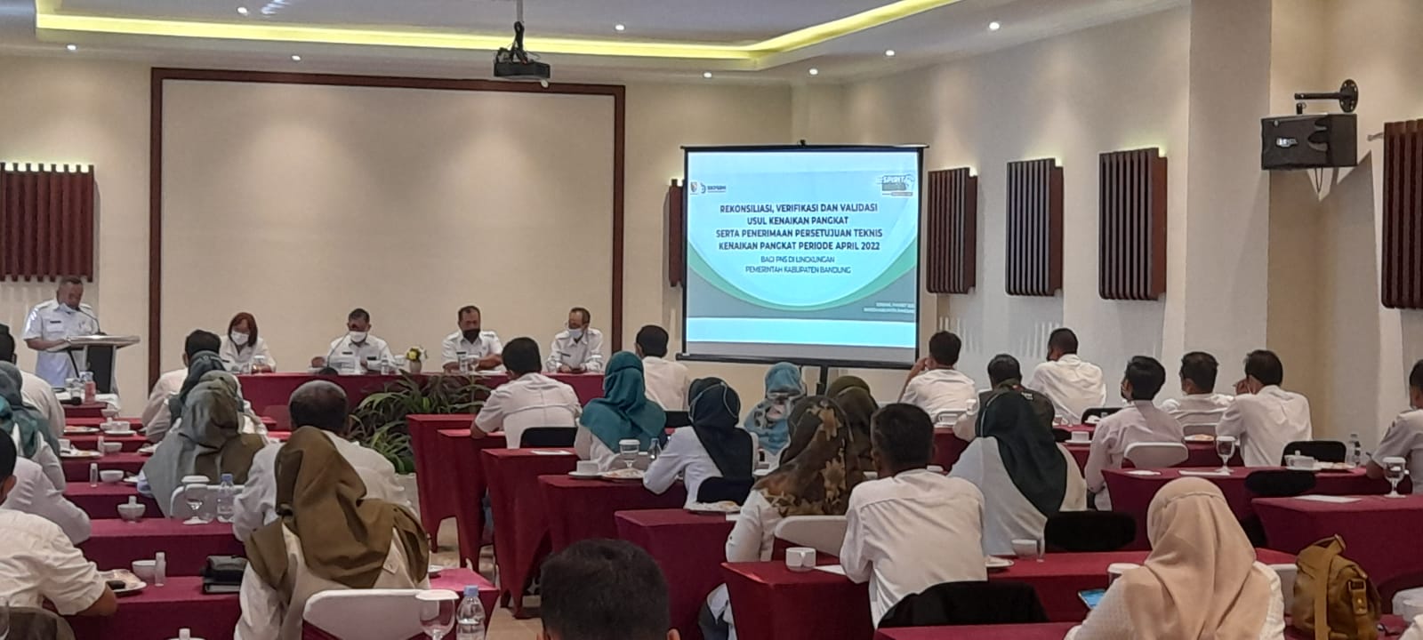 Badan Kepegawaian dan Pengembangan Sumber Daya Manusia bersama dengan Kantor Regional III BKN Bandung pada Tanggal 9 Maret 2022 telah melaksanakan Kegiatan Rekonsiliasi , Verifikasi dan Validasi Usul Kenaikan Pangkat serta Penerimaan Persetujuan Teknis (Pertek) kenaikan Pangkat Periode April 2022 bagi PNS di Lingkungan Pemerintah Kabupaten Bandung yang bertempat di Hotel Grand Sunshine- Soreang.