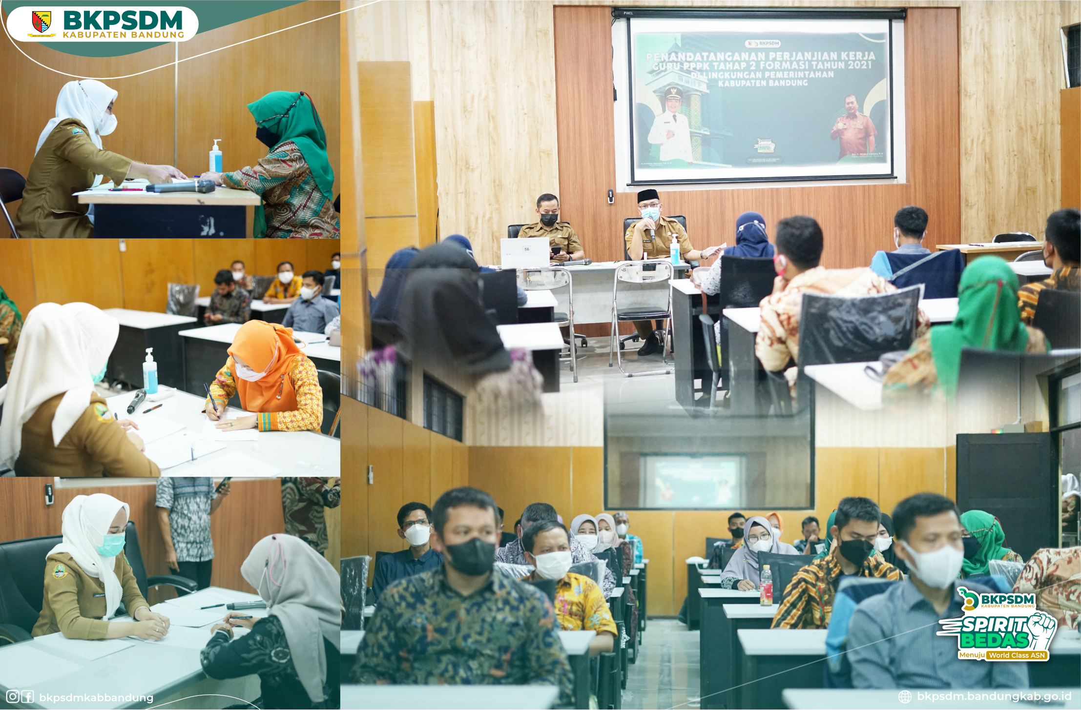Kepala BKPSDM diwakili oleh Kepala Bidang Pengadaan Pemberhentian dan Informasi Kepegawaian Abi Basarah telah melaksanakan Penandatanganan Perjanjian Kerja guru PPPK Tahap 2 sebanyak 483 Orang Formasi Tahun 2021 ini dilaksanakan di ruang CAT BKPSDM Kabupaten Bandung.