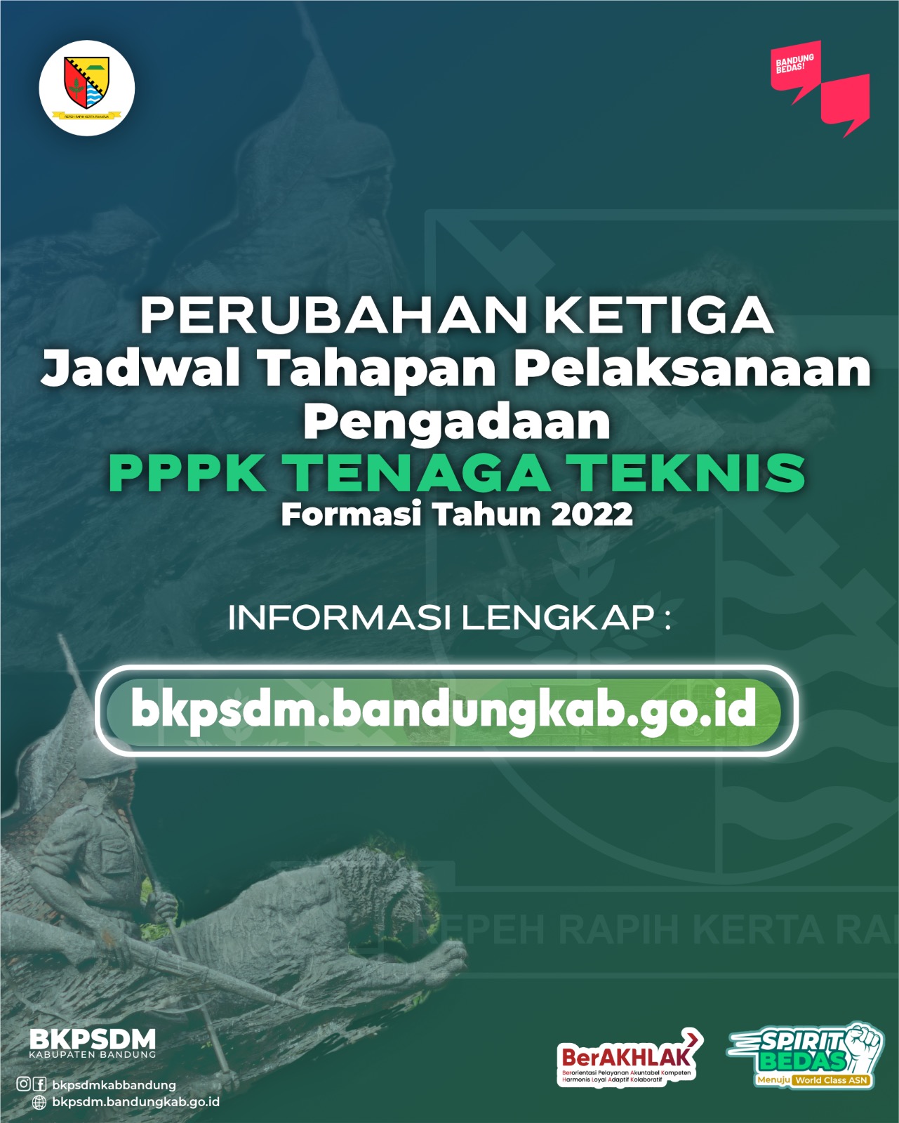 Berdasarkan pengumuman Bupati Bandung Nomor: 800.1.2/705/BKPSDM/2023 tanggal 6 Maret 2023 tentang Perubahan Kedua Jadwal Tahapan Pelaksanaan Pengadaan Pegawai Pemerintah dengan Perjanjian Kerja (PPPK) Tenaga Teknis di Lingkungan Pemerintah Kabupaten Bandung Tahun 2022 dan menindaklanjuti surat Kepala Badan Kepegawaian Negara Republik Indonesia nomor: 4916/B-MP.01.02/SD/D/2023 tanggal 11 Mei 2023 tentang Penyesuaian Tanggal Usul Penetapan NI PPPK JF Tenaga Teknis Tahun 2022 secara elektronik yang diterima oleh panitia seleksi daerah pada tanggal 12 Mei 2023 bahwa terdapat penyesuaian kembali jadwal tahapan pelaksanaan seleksi Tenaga Teknis Tahun 2022.