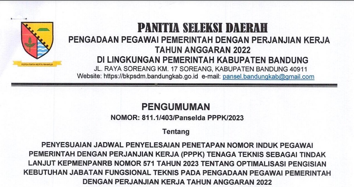 Berdasarkan Keputusan Menteri Pendayagunaan Aparatur Negara dan Reformasi Birokrasi Nomor 571 Tahun 2023 tentang Optimalisasi Pengisian Kebutuhan Jabatan Fungsional Teknis Pada Pengadaan Pegawai Pemerintah dengan Perjanjian Kerja Tahun Anggaran 2022, Pengumuman Bupati Bandung Nomor: 821/1377A/BKPSDM/2023 tanggal 22 Mei 2023 tentang Hasil Seleksi Kompetensi Pegawai Pemerintah dengan Perjanjian Kerja (PPPK) Tenaga Teknis Pasca Sanggah di Lingkungan Pemerintah Kabupaten Bandung Tahun 2022 dan menindaklanjuti surat Pelaksana Tugas (Plt.) Kepala Badan Kepegawaian Negara Republik Indonesia nomor: 7976/B-MP.01.01/SD/K/2023 tentang Penyesuaian Jadwal Penyelesaian Penetapan NI PPPK Jabatan Fungsional Teknis Tahun 2022.