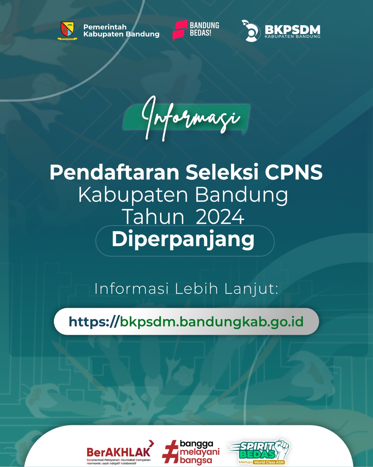 Berdasarkan pengumuman Bupati Bandung Nomor: 810/2420/BKPSDM/2024 tanggal 19 Agustus 2024 tentang Pengadaan Pegawai Negeri Sipil di Lingkungan Pemerintah Kabupaten Bandung Tahun Anggaran 2024 dan menindaklanjuti surat Pelaksana Tugas (Plt) Kepala Badan Kepegawaian Negara Republik Indonesia nomor: 5900/B-KS.04.01/SD/K/2024 tanggal 5 September 2024 tentang Penyesuaian Jadwal Seleksi Pengadaan CPNS T.A. 2024 dapat disampaikan beberapa hal sebagai berikut: