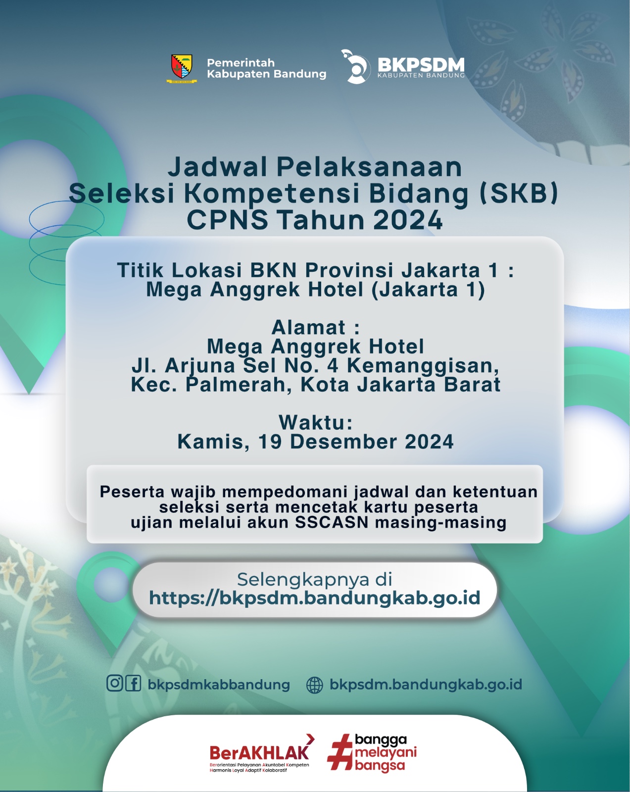Pengumuman Jadwal Pelaksanaan Seleksi Kompetensi Bidang (SKB) CPNS Tahun 2024 Khusus Titik Lokasi BKN Provinsi Jakarta 1 : Mega Anggrek Hotel (Jakarta 1)