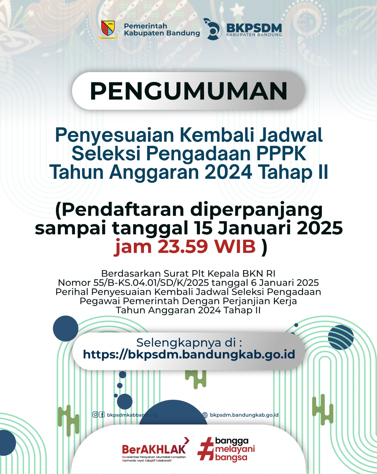 Pengumuman Penyesuaian Kedua Jadwal Tahapan Pelaksanaan Pengadaan Pegawai Pemerintah Dengan Perjanjian Kerja (PPPK) Di Lingkungan Pemerintah Kabupaten Bandung Tahun Anggaran 2024 Bagi Pelamar Tenaga Non ASN Yang Aktif Bekerja Di Instansi Pemerintah (Termasuk Lulusan PPG Untuk Formasi Guru Di Instansi Daerah)
